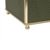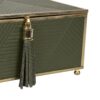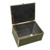 Caixa feita em madeira, vidro e metal, com detalhes dourados.